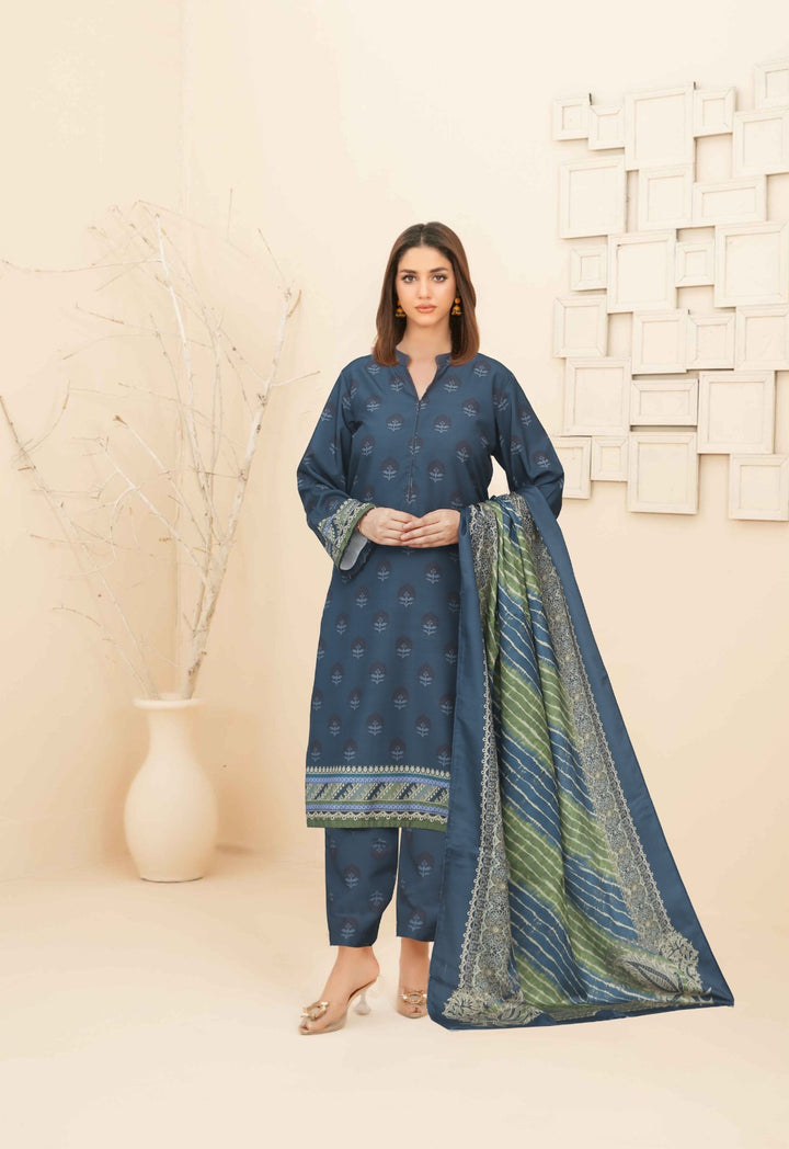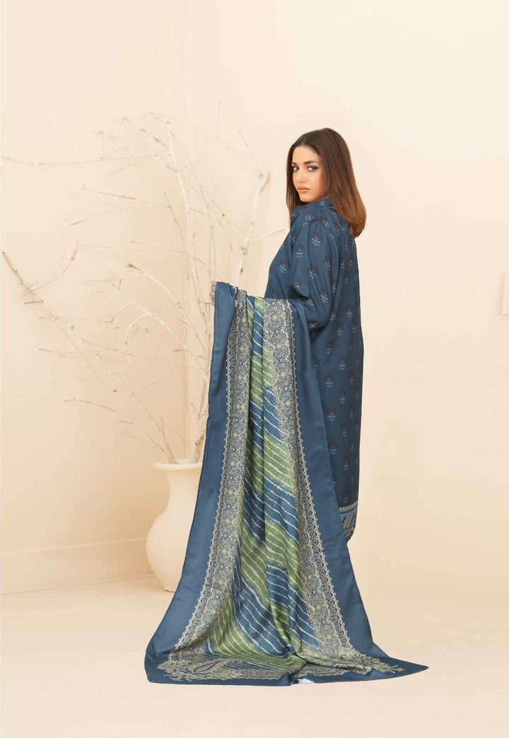 This exquisite Festive/Party Wear three-piece Kurta Set by Mehrma Ethnic features a Twilight Blue Khaddar Straight Cut Kurta with Loose Fit, paired with straight Trouser and Herringbone Dupatta. Lining attached...
